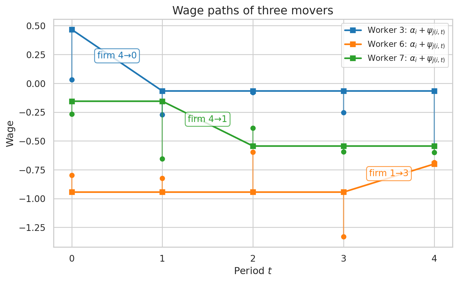 To make this concrete, we simulate a small dataset with \(n_j = 5\) firms, \(n_i = 10\) workers, and \(T = 5\) periods. We select three workers who change employer at least once and plot their wage paths. The lines show the systematic component \(\alpha_i + \psi_{j(i,t)}\), which shifts when a worker moves to a firm with a different \(\psi_j\). The vertical segments show the residual \(\epsilon_{it}\) added on top.