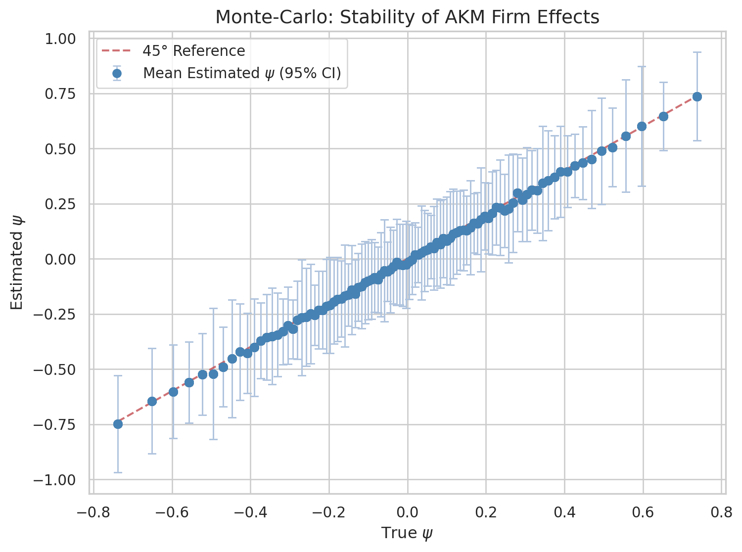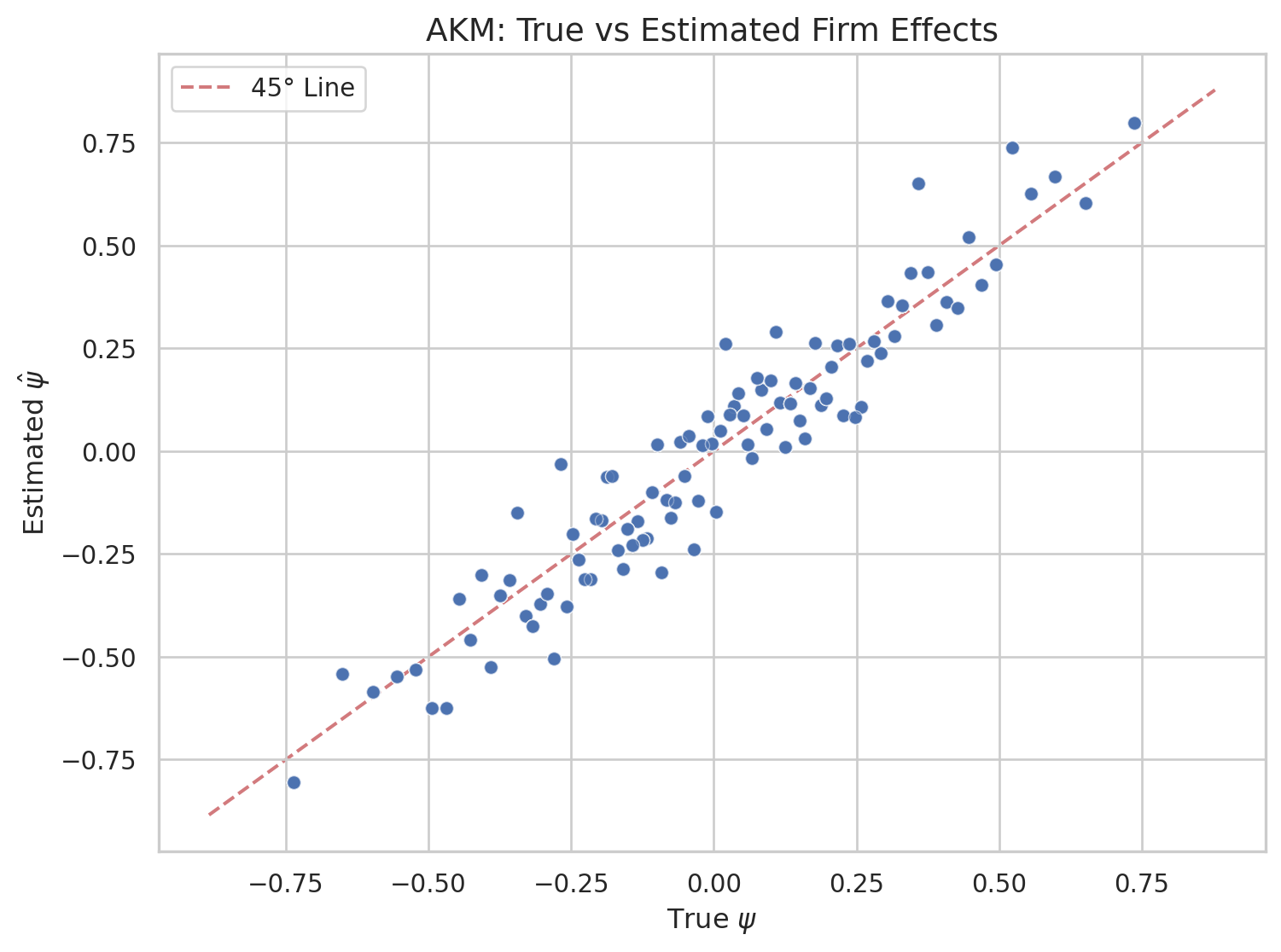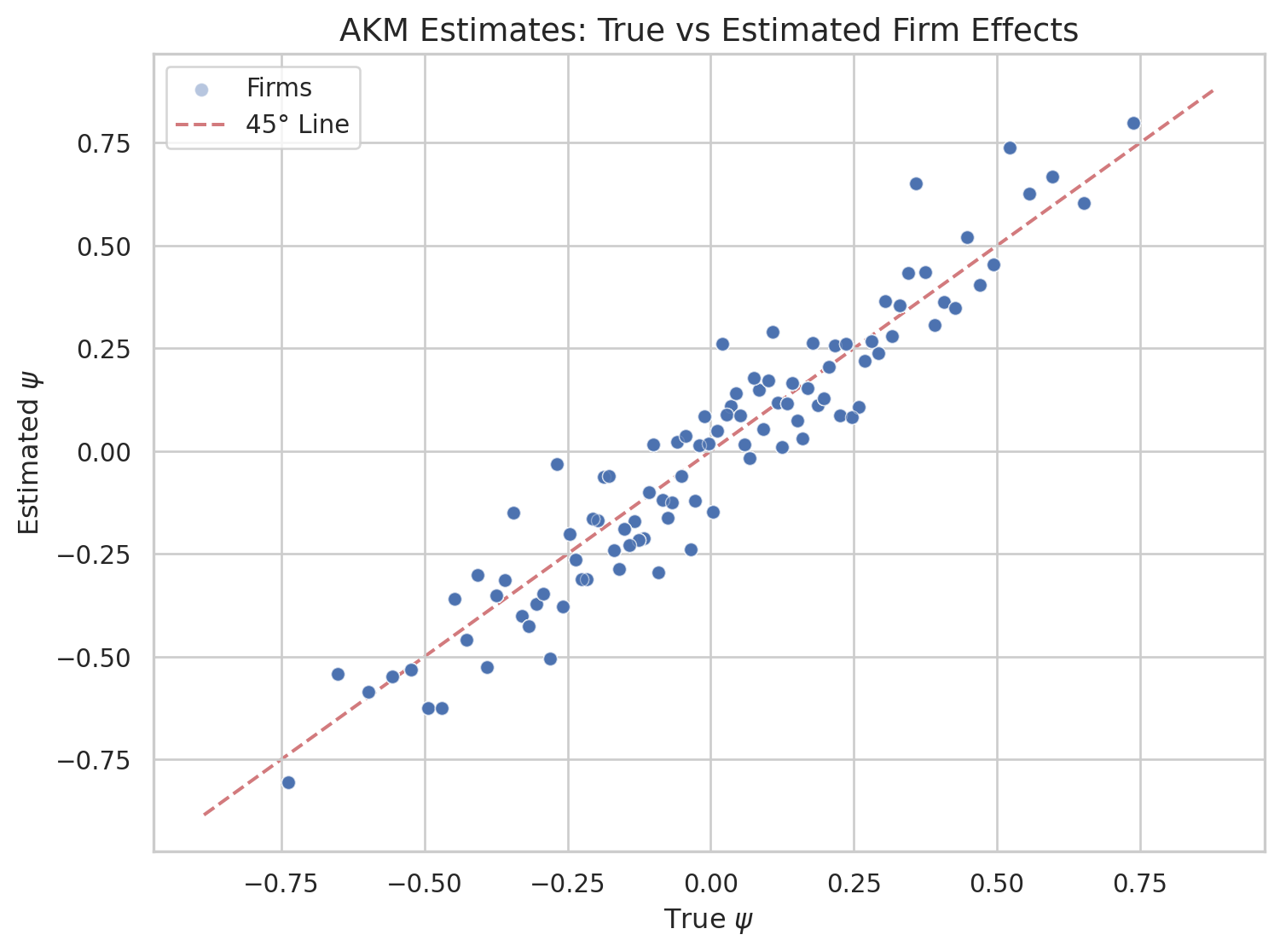 Since we simulated the data, we can compare the estimated \(\hat{\psi}_j\) to the true \(\psi_j\). The scatter plot below shows each observation’s true firm effect on the horizontal axis and the estimated value on the vertical axis. Points close to the 45-degree line indicate accurate recovery; dispersion around it reflects estimation noise — particularly for firms with few worker-period observations.