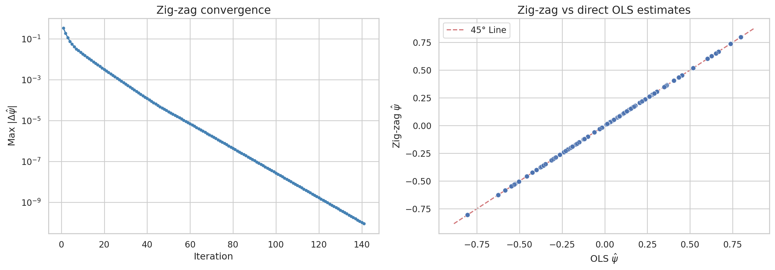 sns.set_theme(style="whitegrid")fig, axes = plt.subplots(1, 2, figsize=(14, 5))# Left panel: convergenceaxes[0].semilogy(range(1, len(convergence_history) +1), convergence_history, '-o', markersize=3, color='steelblue')axes[0].set_xlabel('Iteration', fontsize=12)axes[0].set_ylabel(r'Max $|\Delta \hat{\psi}|$', fontsize=12)axes[0].set_title('Zig-zag convergence', fontsize=14)# Right panel: zig-zag vs OLS estimatespsi_hat_zz_dm = psi_hat_zz - psi_hat_zz.mean()axes[1].scatter(psi_hat_dm, psi_hat_zz_dm, alpha=0.4, edgecolors='w', linewidth=0.5)lims = [np.min([axes[1].get_xlim(), axes[1].get_ylim()]), np.max([axes[1].get_xlim(), axes[1].get_ylim()])]axes[1].plot(lims, lims, 'r--', alpha=0.75, zorder=0, label='45° Line')axes[1].set_xlabel(r'OLS $\hat{\psi}$', fontsize=12)axes[1].set_ylabel(r'Zig-zag $\hat{\psi}$', fontsize=12)axes[1].set_title('Zig-zag vs direct OLS estimates', fontsize=14)axes[1].legend()plt.tight_layout()plt.show()print(f"Max absolute difference between OLS and zig-zag: {np.max(np.abs(psi_hat_dm - psi_hat_zz_dm)):.2e}")