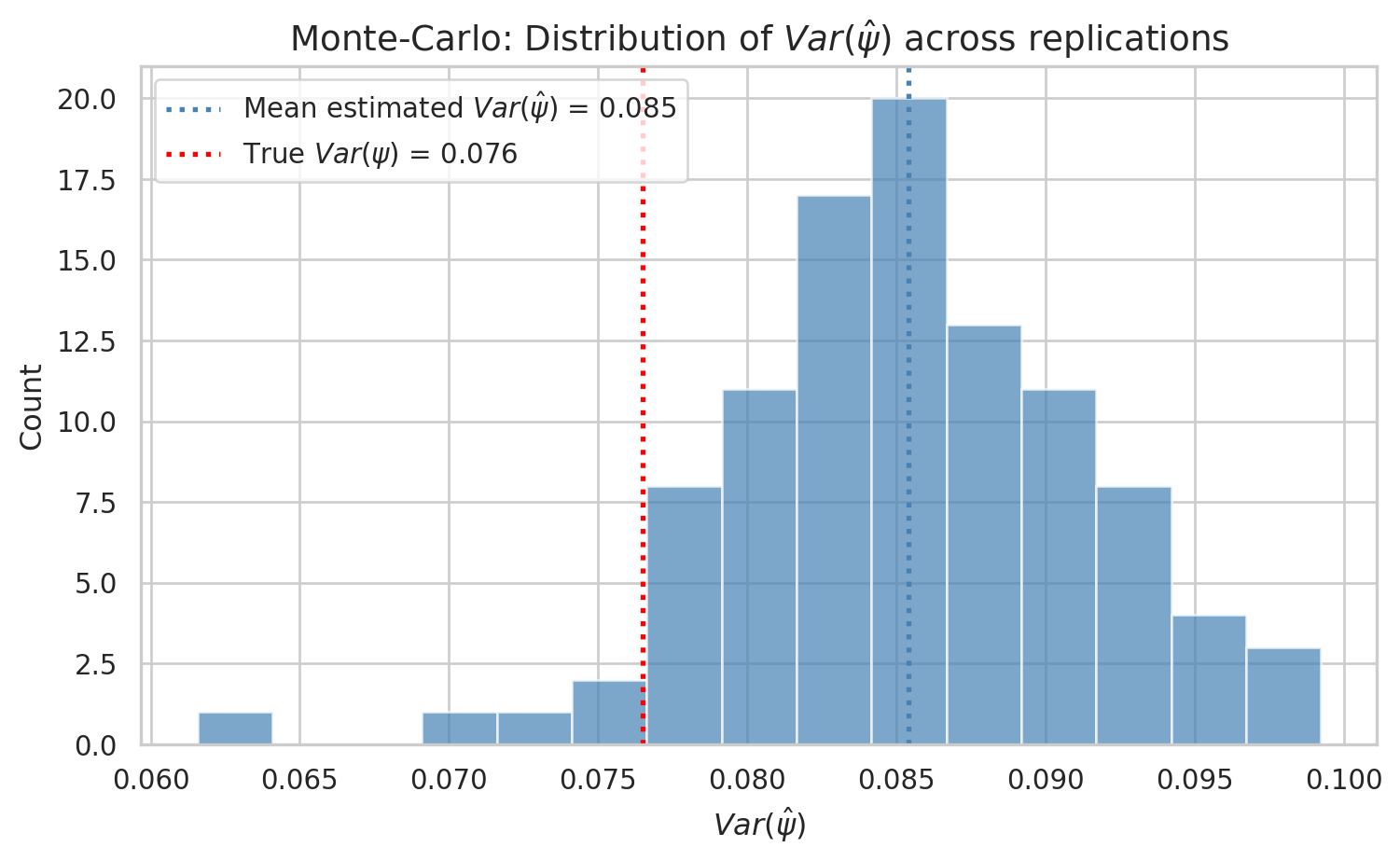 sns.set_theme(style="whitegrid")plt.figure(figsize=(8, 5))plt.hist(var_psi_reps, bins=15, edgecolor='white', alpha=0.7, color='steelblue')plt.axvline(np.mean(var_psi_reps), linestyle=':', color='steelblue', linewidth=2, label=rf'Mean estimated $Var(\hat\psi)$ = {np.mean(var_psi_reps):.3f}')plt.axvline(data['psi'].var(), linestyle=':', color='red', linewidth=2, label=rf'True $Var(\psi)$ = {data["psi"].var():.3f}')plt.xlabel(r'$Var(\hat\psi)$', fontsize=12)plt.ylabel('Count', fontsize=12)plt.title(r'Monte-Carlo: Distribution of $Var(\hat\psi)$ across replications', fontsize=14)plt.legend()plt.tight_layout()plt.show()